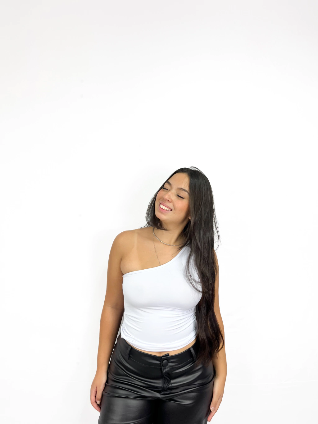 Modelagem: Cropped justo com uma única alça estilo mula manca e drapeado nas laterais que valorizam o corpo.